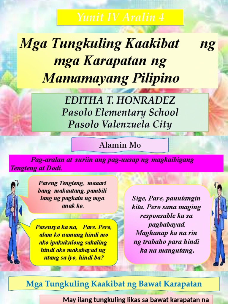 VALLE Teacher AP IV Panoypoyan Elementary School Pagganyak na awitin 10 mga karapatan ang dapat taglayin Pagmamahal edukasyon unang ililigtas Natatanging kalinga lahi kalusugan Paglalaro kapatiran maging makabuluhan WoAHHHHHH. Yunit 4 aralin 4. Maaari silang maghanap ng mga pagkakataon para makapaglingkod ang kanilang mga anak sa mga miyembro ng mag-anak at sa ibang nakapaligid sa kanila.
