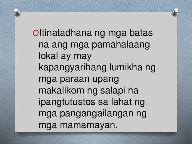 45 rows Ang Kagawaran ng Interyor at Pamahalaang Lokal ng Pilipinas Ingles. Tungkulin ng Konseho ng Pamahalaang Lokal sa Pag-unlad NG Mga Pamayanan sa Pamayanan. Bagamat maganda ang adhikain ng batas na palakasin at mas mabigyan ng oportunidad ang mga lokal na pamahalaan na umunlad ay marahil hindi ito naging ganap na.