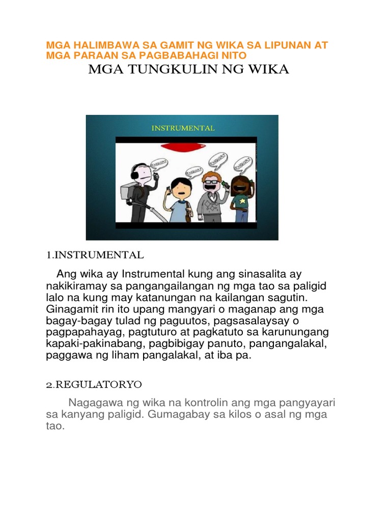 Gamit ng wika ayon kay halliday 3. Instrumental ang wika ay ginagamit upang makuha ng tagapagsalita ang kanyang mga kinakailangan katulad lamang ng materyal o serbisyo. Wika pasalita man o pasulatang instrumenting ginagamit ng mga tao sa loob ng lipunang ito upang makipag-ugnayan sa isat isa 3.