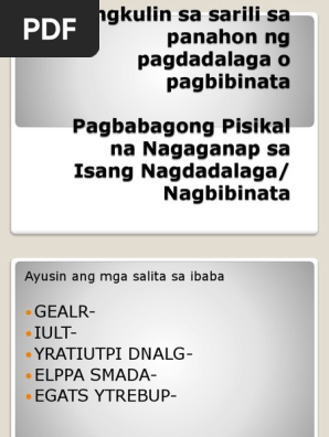 More Mature relations sa kasing edad 5. Pagbabagong Pisikal na Nagaganap sa Isang Nagdadalaga Nagbibinata Ayusin ang mga salita sa ibaba GEALR- IULT- YRATIUTPIDNALG- ELPPA SMADA- EGATS YTREBUP- aAno ano ang mga gawaing dapat isagawa upang mapanatiling malinis maayos at malusog ang katawan. Course Title PNS 12345.