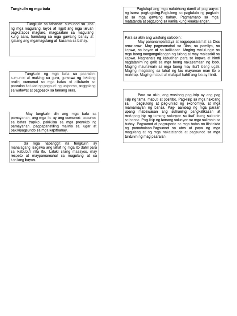 May mga tungkulin na dapat gampanan ang mga bata sa paaralan tahanan Read More. Matapos mong basahin ang aralin ito magagawa mo na ang sumusunod. Sa oras na ang iyong grado ay 9 o 10 taong gulang maaari siyang gumawa ng mga.
